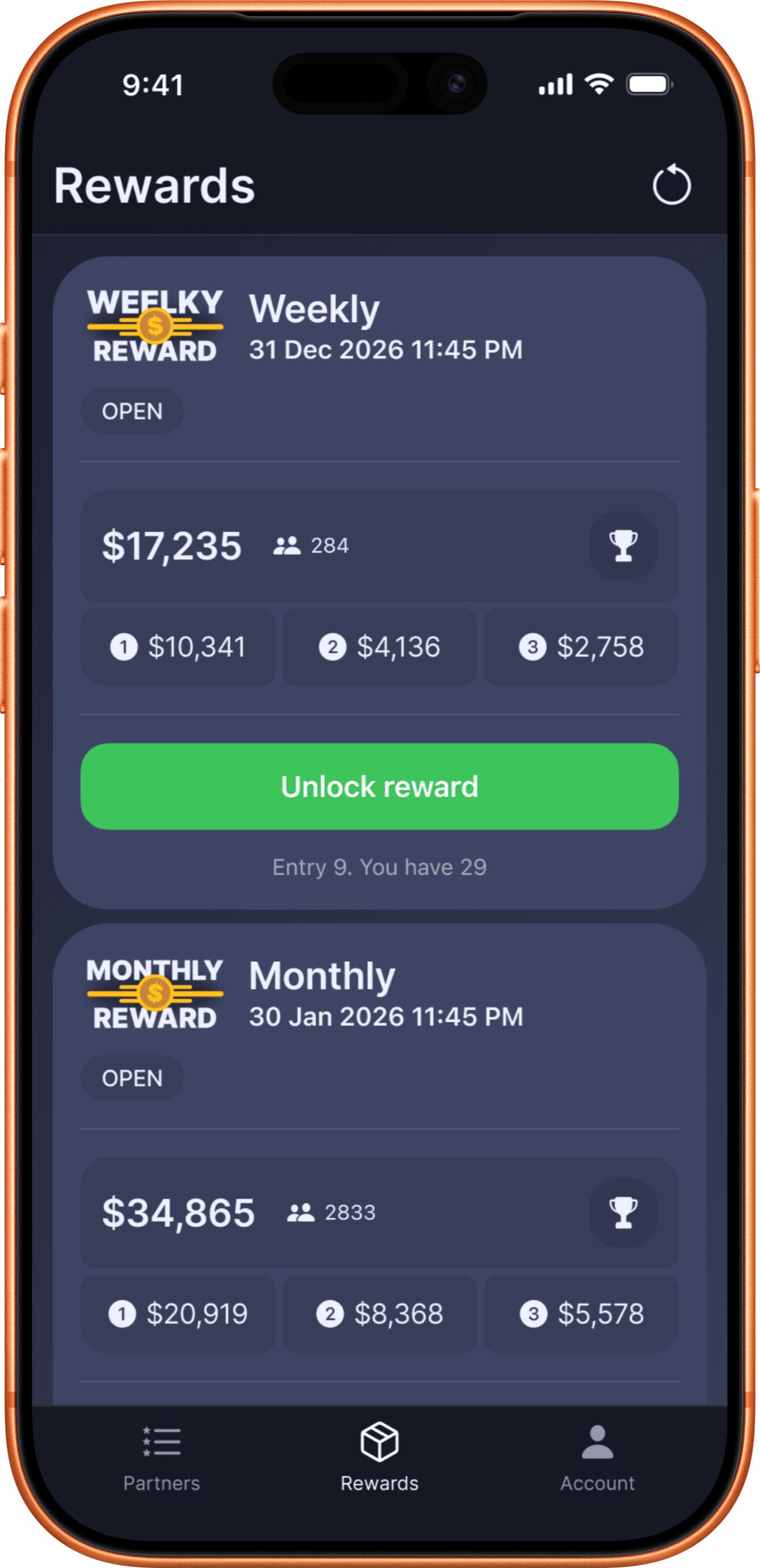 All upcoming and active Rewards are listed in the App. Each Reward includes a preview with key information such as entry requirements, availability period, and prize distribution.