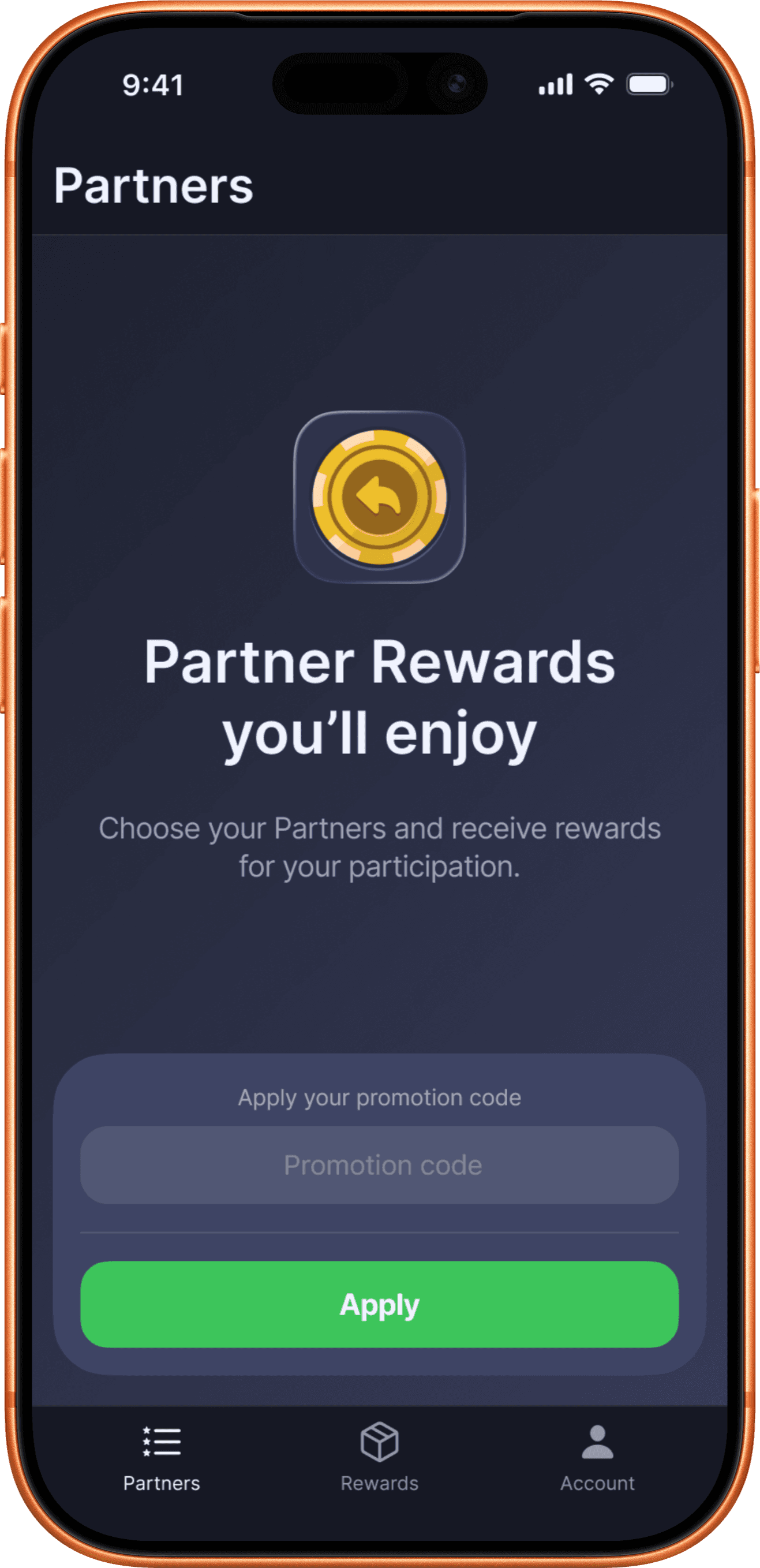 Your Partner provides you with a personal promotion code, which allows you to access Rewards inside the App.